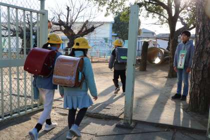 正門と幼稚園門、昇降口の中でも、代表委員会が元気なあいさつをおくっています。