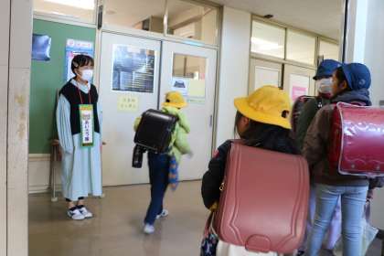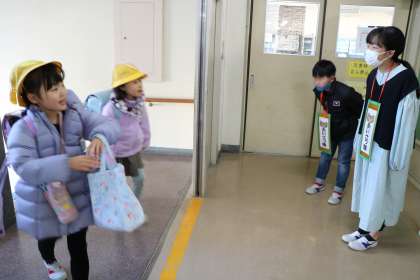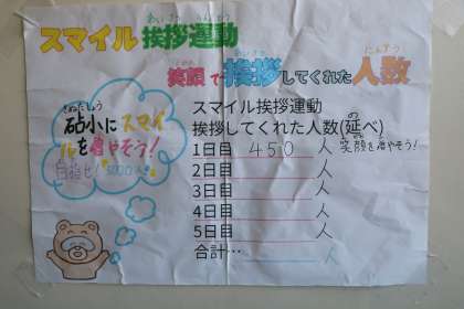 今回はカウンターを持ち、おおよそ何人の砧っ子が挨拶してくれるか数えるのだそうです。東階段の踊り場に立つ代表委員に1年生は、朝登校して「おはようございます」、支度が終わって外遊びに出るときにまた「おはようございます」いつでも挨拶できるのです。すてきな砧っ子です!