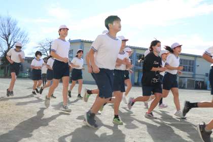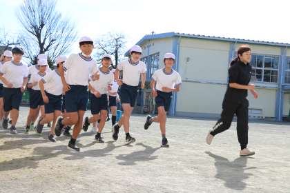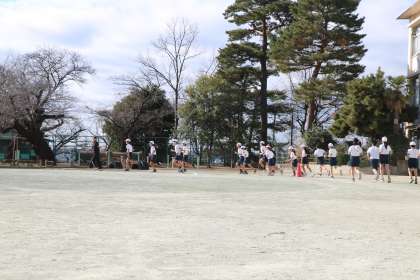 午前中はとっても暖かい中、6年生が持久走に取り組んでいました。まず先生を先頭にコースの確認です。