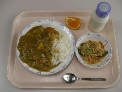 カレーライス こんにゃくサラダ 清美オレンジ 牛乳
