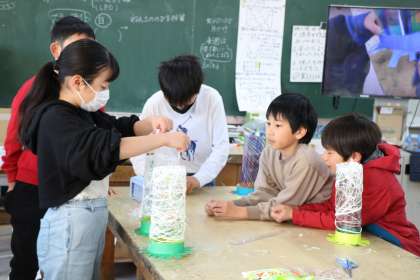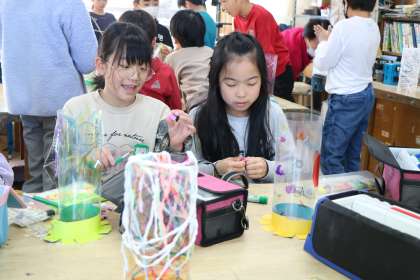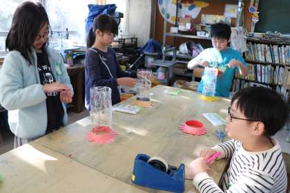 4年生図工「ゆめいろランプ」の様子です。模様を書いたり色を付けたりしたラミネート版を円柱の形に曲げて固定し土台を作ります。色や模様が足りないところを考えたり、軽量粘土で飾りにしたり、自分だけのランプを工夫して作っています。
