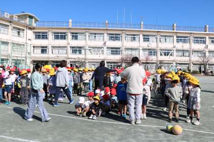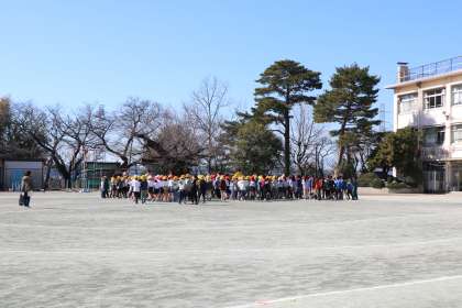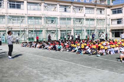 今日は20分休み時間に、予告なしの避難訓練を実施しました。こうていであそんでいた1・2・3年生は速やかに校庭の中央に集まって指示を聞いていました。