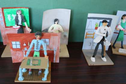6年生教室前には今、図工の作品「名画とコラボ」と「こんな大人になりたいな」が飾られています。