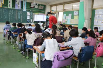 写真は1年生国語「どうぶつの赤ちゃん」の読み取りをしている様子です。