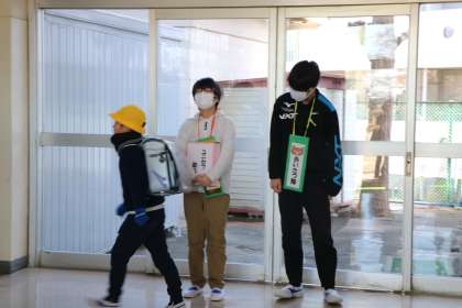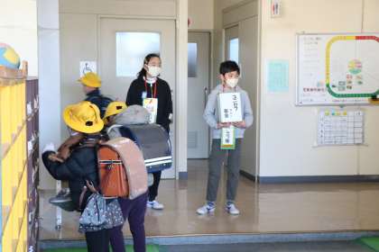 せっかく昇降口で活動するなら、挨拶もしっかりやろう!ということで、元気の良い「おはようございます」の声が響きます。