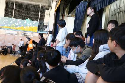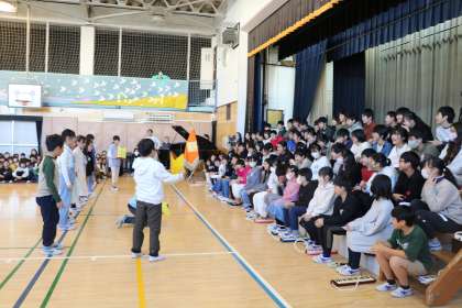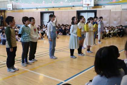 4年生の出し物の様子です。4年生は、6年生が学芸会「エルコスの祈り」で歌った「語りかけよう」の歌を6年生と一緒に歌いながら言葉で、最後は応援の呼びかけで、感謝の気持ちを表現しました。