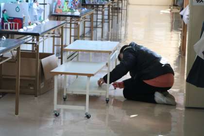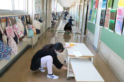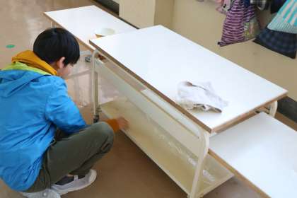 保健給食委員会は各教室の給食配膳台を磨いています。とってもきれいになりました。