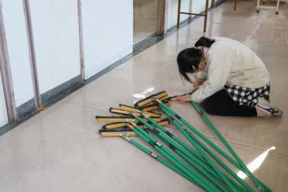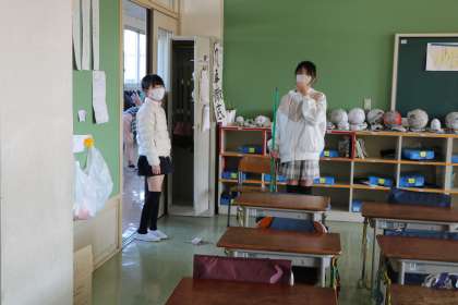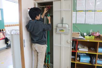 美化委員会は自分の担当クラスの清掃用具箱の中の用具をきれいにしたり、見かねて教室清掃をしたりしています。