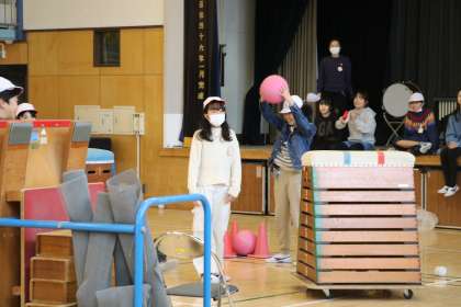 「源平合戦」というゲームだそうです。新聞紙を丸めて作った球を投げながら敵陣の宝=ピンクのボールを奪った方が勝ちです。