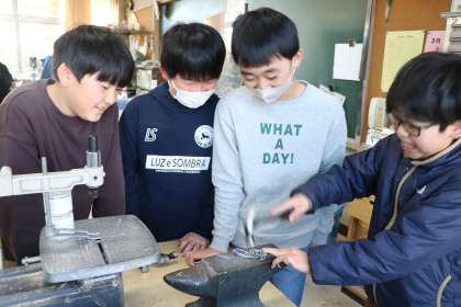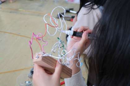 角材などの木切れに、ステップルで針金を固定し針金の形を思いのままに変えたり組み合わせたりして作っていきます。金色のワイヤーは1人2本までです。どのように使おうか「もったいなくてなかなか使えない〜」と悩む子もいます。ポスカで色を付けたりワイヤーをたたいて平らにしたり様々な工夫を凝らしています。