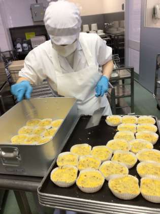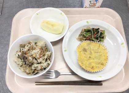 切干大根は、大根を細く切り、天日で干して乾燥させた保存食です。太陽の光を浴びることで、糖化されて甘味がさらに増します。さらに、骨や歯を丈夫にするカルシウムや貧血の予防効果がある鉄分、代謝を促進するビタミンB1、B2などの栄養価が高くなります。他にも食物繊維など不足しがちな栄養素がとれる切干大根をおいしく食べられる卵焼きにしました。こどもたちからも人気がある献立です。