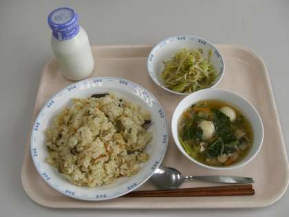 山菜ピラフ 春雨スープ 野菜の中華風味 牛乳