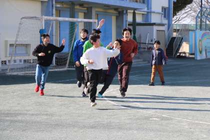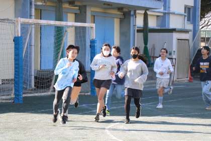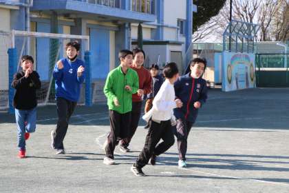 6年生が楽しそうに、何かやりながら走っています。砧小学校の校庭をみんなで走るランランランもあと4回です。