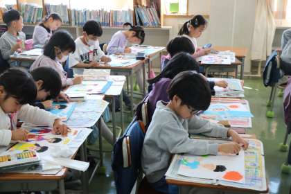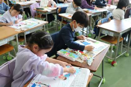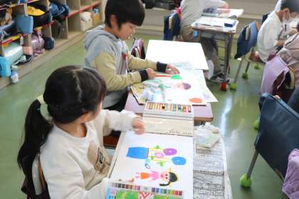 1年生が描いている絵は、新しく入学してくる1年生にプレゼントするのだそうです。1年間の楽しかったことを思い出しながら描いていました。