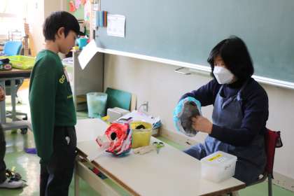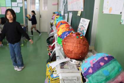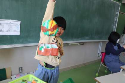 膨らませた風船を使って張り子のかざりを作りました、置物あり、吊るす作品あり、色とりどりで楽しいです。