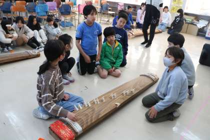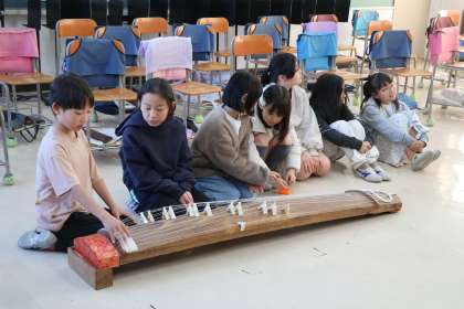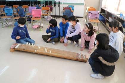 4年生音楽、琴の学習です。はじめリコーダーで練習した後、グループに分かれて琴に触れます。