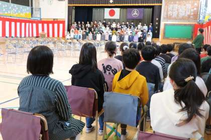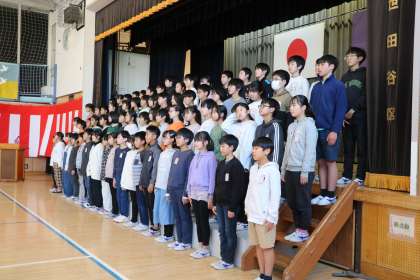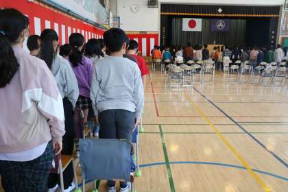 5時間目は初めての5・6年生合同卒業式練習です。5年生のリコーダーに合わせて入退場の練習をし、5年生は初めて6年生の「門出のことば」を聞きました。