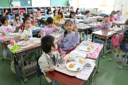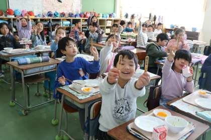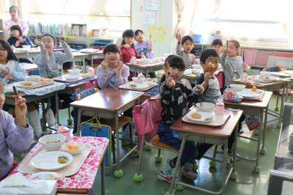 実は・・・今日の五平餅の「あたり」は全員が「あたり」になるように用意してくれたそうです。金属の型を火でよく焼いて五平餅の串に焼き印を入れます。一本一本給食室で準備したのだそうです。