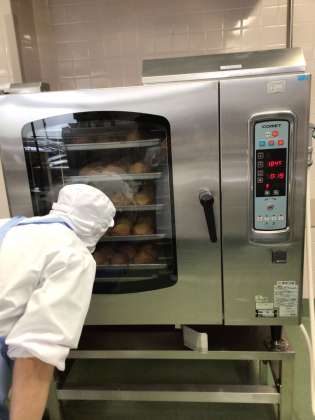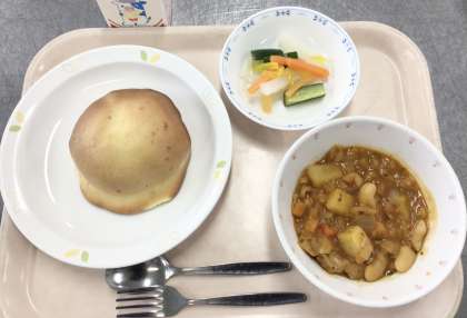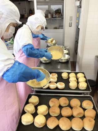 丸いパンの上に、小麦粉、卵、さとう、バターを合わせて作ったビスケット生地をのせてオーブンで焼いてつくりました。