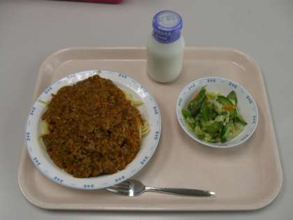 スパゲティミートソース アスパラガスのサラダ 牛乳