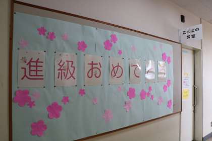 先生たちは、昇降口や廊下に入学・進級をお祝いする装飾をしています。