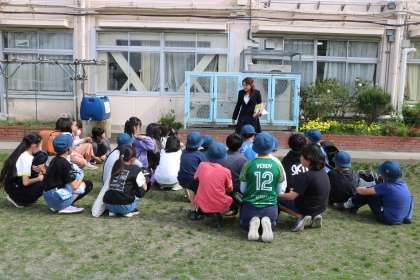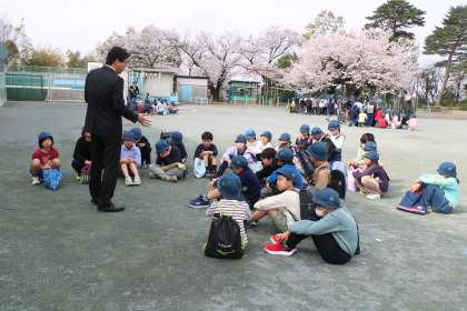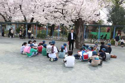 始業式後、2年生は入学式の歓迎の催しのため、6年生も入学式準備のために教室へ上がりました。そのほかの学年は校庭で学級開きです。担任の先生を囲んで配布物をもらい明日の話を聞き下校です。