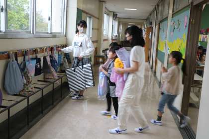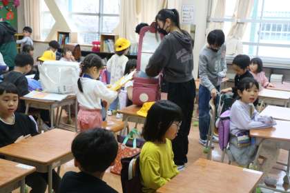廊下にかける荷物も、6年生がやさしく教えてくれます。