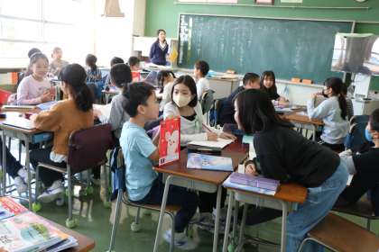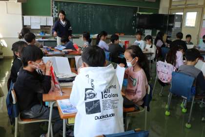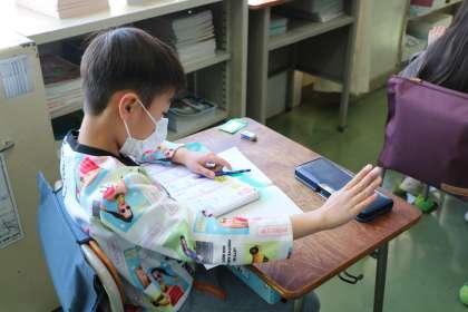 国語の学習の様子です。友達と意見を言ったり聞いたり相互に学びあいながら学習を進めています。また新出漢字についても、手で空書きをしたり、熟語を確認したりしながら一文字一文字丁寧に学習しています。