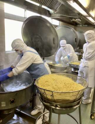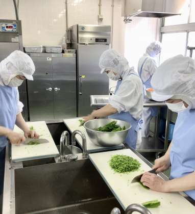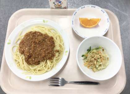 給食のミートソースには、豚ひき肉とたっぷりの野菜の他に、栄養のことを考えて鶏レバーと大豆が入っています。大豆は苦手な子も少なくありませんが、ゆでた後、刻んでからミートソースに入れるととても食べやすくなります。味も甘味が出ておいしくなります。