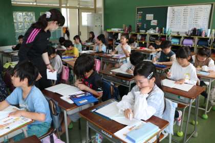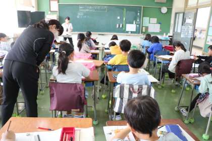 3年生算数の様子です。砧小学校では3年生以上は少人数算数を取り入れています。3学級を4っつに分けて学習します。今日はその準備授業なので、担任の他に算数の先生も授業に入っています。