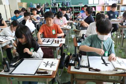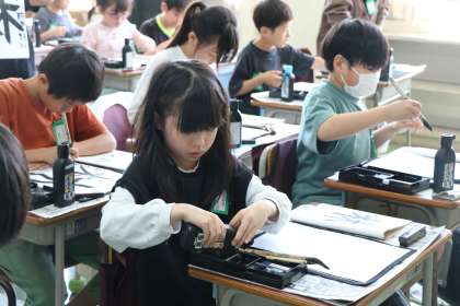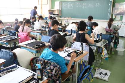 4年生書写の様子です。入っていくのをためらうほどで、とっても静かな教室でした。集中して4年生初めての書写に取り組みました。