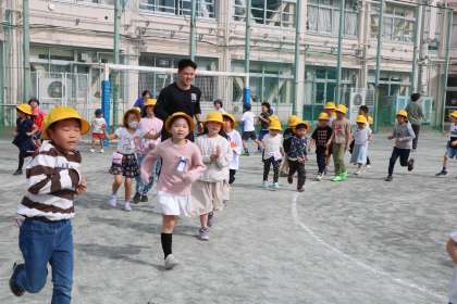 3年生は一番外側、2年生はその内側、1年生は一番内側を走ります。ゆっくりでも自分のペースを大切にと、担任の先生たちは声をかけて励ましながら一緒に走ります。