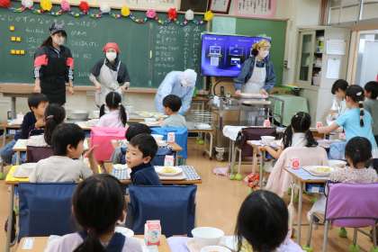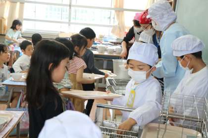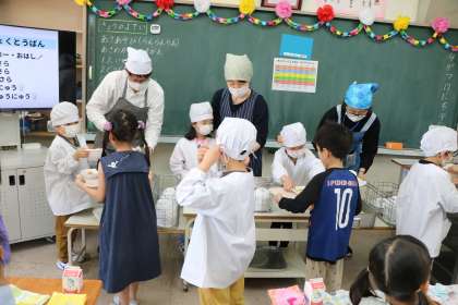 お手伝いに来てくださる「小1サポーター」の方々も、専科やことばの教室の先生方もいらっしゃいますが、1年生の給食当番も頑張っています。
