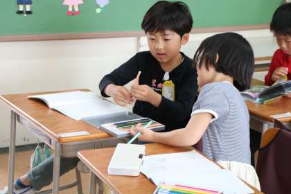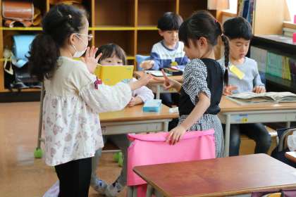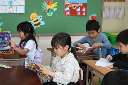 休み時間、今日は4・5・6年生高学年の外遊びです。1・2・3年生低学年は室内遊びです。1年生はお友達と絵を描いたり本を読んだりして楽しんでいます。