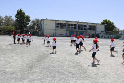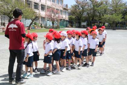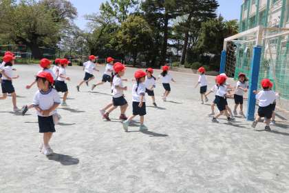 こちらのクラスは、「サッカーゴールのポールにタッチしてきて!よーいスタート」