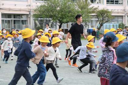 毎朝子どもたちが登校する前に、砧小の先生たちは、ランランランのコースラインを2本引いています。線の外側を上学年が走り、下学年は2本の線の間を走ります。安全に楽しく走れるよう担任の先生たちも、子どもたちに声をかけながら一緒に走っています。