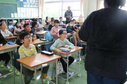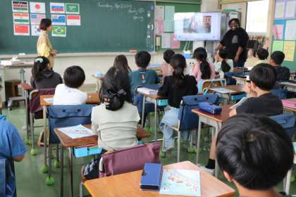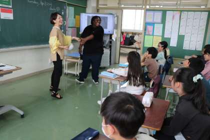 4年生外国語活動の様子です。今年度から、外国語の先生は、英語専科講師の先生とALT(AssistantLanguageTeacher)と2名で行います。今日は世界のいろいろなことばであいさつをしよう・・・の学習です。