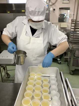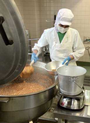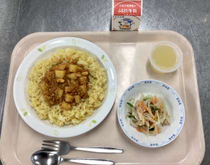 チリビーンズライスはカレー粉とトマトピューレを入れて炊いたカレー味のごはんの上に、大豆が入ったトマト味のミートソースをかけたものです。チリパウダーが入っていますが、辛みはなく、子供たちの好きな味に仕上げています。給食ではこどもたちから人気のある定番メニューです。朝から給食室で手作りしたりんごゼリーもこどもたちから人気でした。