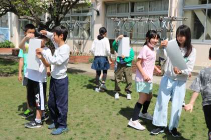 4年生理科「一日の気温の変化を調べよう」の様子です。前回の学習で温度計を使いましたが直射日光が当たってしまい結果がばらばらだったことに困りました。そこで今日は、温度計にひと工夫することにして校庭へ出発です。