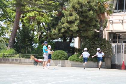 5年生体育。50メートル走のタイムを計っています。高学年ともなると先生は50メートル先のゴール地点にいてタイムを測り、スタート合図は子どもたち交代でできるようになります。さすが高学年です。