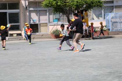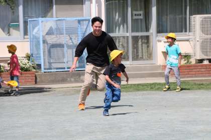 先生が鬼の「鬼ごっこは」、子どもたちはもちろん、先生も真剣です。