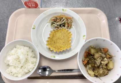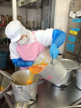 今日の卵焼きに使った卵の量は約700個です。それをひとつひとつ手で割って、卵焼きを作っています。1年生はカップに入った黄色い食べ物を不思議そうに「これなんですか?」と聞いていましたが、卵焼きを一口食べたら「うまっ」とつぶやいていました。
