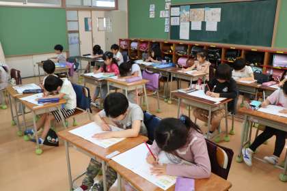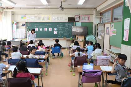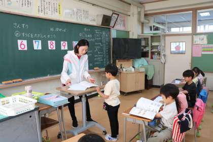 1年生算数の様子です。教室に入り黒板を見ると、一目で何の学習をどこまで進んでいるかがわかります。それは子どもたちも同様です。担任の先生は授業での視覚効果も工夫し、誰でも、いつでもわかりやすい授業を目指します。