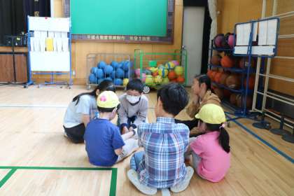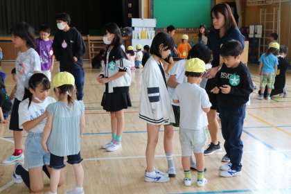 自己紹介をしたり、遊びたいことを聞いたり、年長さんの顔を覗き込みながら、やさしい5年生です。