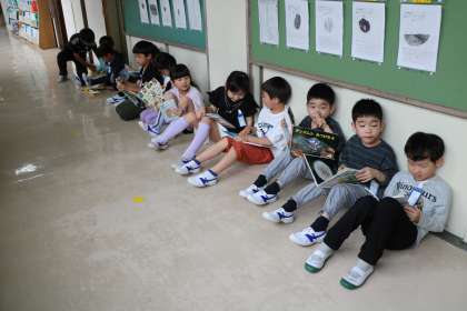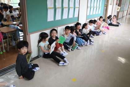 学級半分の友達が掃除をしている間、もう半分の子たちは廊下で本を読んで待っていたり、教室の掃除の様子を見ていたりしました。掃除が終わったら、今日は初めてのお昼休み、そして5時間目です。お昼休みに外で元気いっぱい遊んだら、午後の授業も頑張ります。