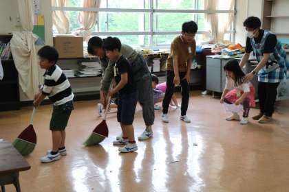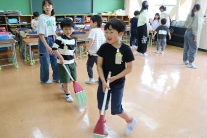 6年生がほうき、雑巾の水拭きの仕方、からぶきの仕方を丁寧に教えてくれます。
