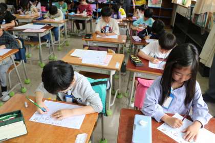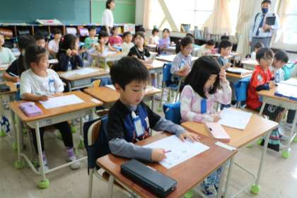 「さあ書こう」のあとは、シ〜ンと静かに集中して取り組んでいました。元気な時と集中するときのメリハリがついていて、とても立派な1年生です。