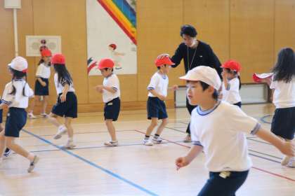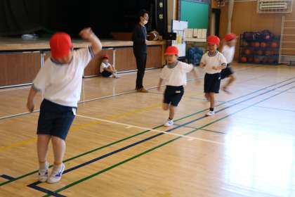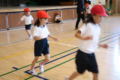 タッチされたら鬼が増えます。鬼は帽子を白にします。たくさん体を動かして運動しました。