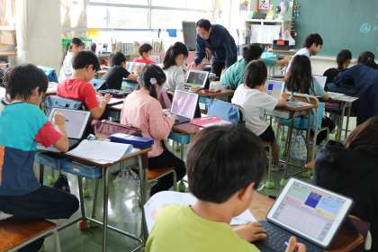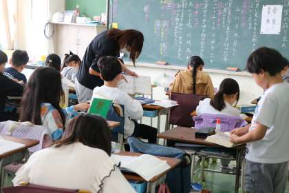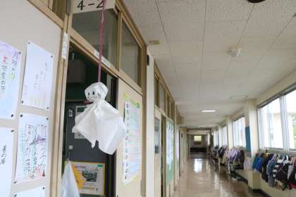 4年生は調べ学習、5年生は辞書を使って学習しています。4年生の教室前に大きなテルテル坊主君がかけられています。