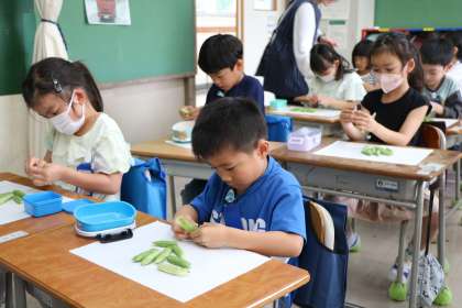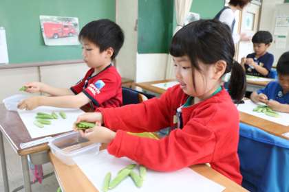 栄養士の先生のクイズは、グリンピースのお花はどれでしょう?というクイズでした。どんなお花なのか家でお話しできるかな?